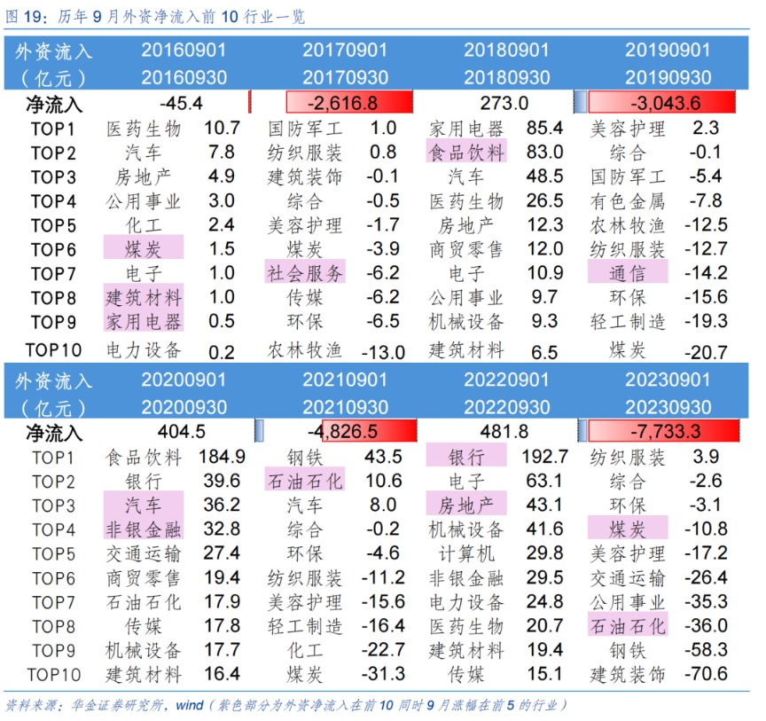 核心资产9月可能有所表现。(1)历史经验上,外资流入较多的行业9月表现相对占优。我们将历年9月外资净流入TOP10的行业与其涨幅进行比较发现:一是外资流入较高的行业9月涨幅较好,自wind有数据的8年来,外资流入排名前5的行业有5年出现在9月涨幅前5之列,分别是2018年9月、2020年9月、2021年9月、2022年9月、2023年9月。二是9月外资净流入多流向核心资产,历年的9月净流入TOP3的行业多集中在以医药生物、汽车、家用电器、美容护理、食品饮料为代表的核心资产。(2)当前来看,公用事业、国防军工、银行行业基金和外资流入较多。一是外资流入方面,2024/5/20-2024/8/29期间,公用事业、国防军工、银行等行业外资流入幅度居前,分别为129.4、15.4、2.0亿元。二是9月看外资可能继续流向核心资产:部分核心资产行业基本面继续改善,如细分行业持续涨价叠加主动补库趋势延续下盈利高增的基础化工行业,新能源车需求端显示回暖、上半年风电发电量高于预期、储能投资增速维持高水平下的电新行业,暑期效应下限额以上企业商品零售额(食品、饮料、烟酒)同比增速维持7.5%高位的食品饮料行业,内外需同步维持高增、库存小幅上升的家电行业。