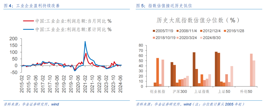 比照复盘,今年9月A股可能有反弹机会。比照复盘,今年9月来看:(1)经济和盈利修复、积极的政策加速落地可能使A股9月出现反弹。一是当前A股已处于历史低位:上证PE-TTM分位数(2005年起计算,下同)仅处于24%左右的低位,上证50、沪深300等指数估值分位数也处于接近历史大底的位置;当前全A换手率分位数处于38%左右的中性偏低位置,上证指数、上证50、沪深300、创业板指和科创50的换手率分位数分别为32%、55%、37%、21%、3%,同样处于低位。二是经济和盈利修复:中报盈利增速大概率较一季报和年报继续回升,截至2024/8/29,全部A股披露率为93.2%,且整体法可比口径下2024H1全部A股归属母公司净利润同比增长率为-2.0%,相比2024Q1全部A股归属母公司净利润同比增长率的-4.9%有所回升,与2023年报相比也有所修复。三是政策和外部事件9月可能偏积极:首先,在三中全会及政治局会议积极定调下,地产收储、以旧换新和设备更新等项目持续落地实施,近期如北京、湖北、浙江等省份出台了新一轮消费品以旧换新政策或行动方案,对补贴力度、覆盖产品范围均有提升,此外商品房以旧换新方面,多地政府也积极响应,9月地产放松、提振消费、超长债发行等稳增长政策可能加速落地;其次中美关系短期有所缓和,中美元首沟通后续可能落实,叠加9月美联储极大概率进行首次降息操作,外部事件偏积极下不易对市场情绪形成负面冲击。(2)今年9月美联储大概率首次降息,因此9月国内经济基本面可能弱修复、政策偏积极等导致A股可能出现反弹。一是9月美联储大概率首次降息,有助于推动我国基本面持续弱修复:工业企业盈利持续回升,7月工业企业盈利当月同比增速录得4.1%(前值为3.6%),主要受益于油价回调导致企业成本降低,考虑到后续全球流动性迎来宽松拐点,有望进一步助力我国基本面修复,后续工业企业盈利大概率继续回升。二是政策偏积极,国内货币政策同样有宽松空间,降息降准预期偏强下叠加稳增长政策持续落地,A股后续可能出现反弹。