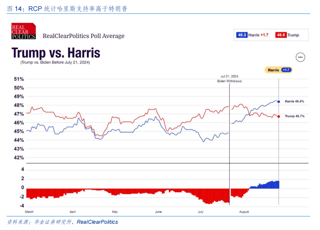 风险偏好9月可能回升。(1)美国大选焦灼,美国改善中美关系意愿上升,中美高层短期再次对话,中美关系短期改善。一是美国大选持续推进,哈里斯支持率胜于特朗普:据 RealClearPolitics统计的民调数据,截至北京时间2024/8/29,哈里斯支持率上升至48.3%,高于特朗普的46.6%,且美特别检察官对特朗普提新诉状,对特朗普竞选可能产生一定影响,在美国大选自顾不暇、且结果不确定性偏强的环境下,后续对华的政策打压可能减轻,市场情绪后续有望改善。二是美国改善中美关系意愿上升,中美高层短期再次对话:首先,近日国防部表示,就中美两军战区领导通话安排,中美双方正在通过军事外交渠道开展沟通,后续中美有望通过军事外交渠道就两军战区领导通话安排展开沟通,两国高层对话交流持续推进;其次,近日沙利文访华,为美国总统国家安全事务助理时隔八年再次访华,中美双方积极落实两国元首旧金山会晤共识,大选前拜登政府稳定中美关系意图较为明显,中美关系短期改善趋势不变。(2)美联储9月大概率降息,可能提振全球市场风险偏好。本轮美联储大幅加息,自2022年3月至2023年7月之间共加息11次共计500BP,对全球流动性形成明显冲击。当前市场对9月首次降息基本达成共识,仅对于受薪资数据影响的降息幅度存在一定分歧。因此后续9月若美联储如期降息,全球流动性迎来拐点,则有望对风险偏好形成明显提振。